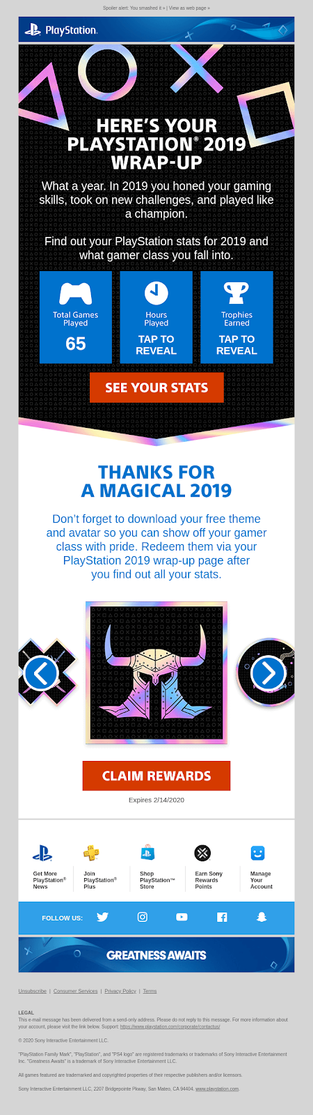 You can further personalize the customer’s experience by allowing them to take a look back on their time with your brand. For example, Sony sends PlayStation gamers a wrap-up email at the end of each year, showcasing their usage stats over the last twelve months:
