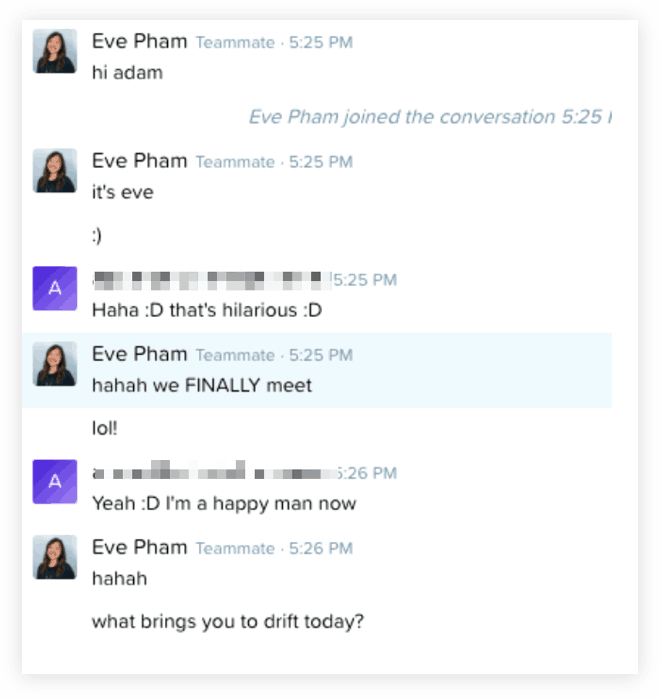 Assuming that Eve was then able to help Adam with his actual Drift-related question, it’s safe to say her friendly, lighthearted greeting added that “extra something” to make his experience much more memorable.